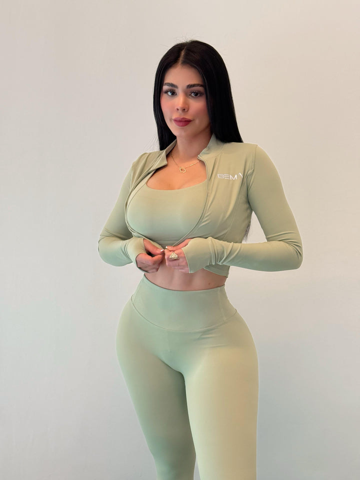 Set de 3 piezas: top tipo halter alto impacto, leggings cintura alta y corte V que da forma a tu cuerpo, chamarra a juego. Sin push up.
